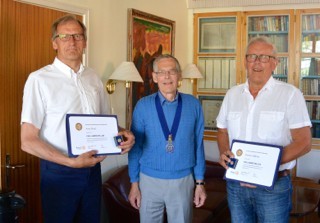 Så er det Steinar, klubbens kasserer gjennom mange år. Du har laget oversiktlige regnskaper hele tiden, og jeg tror ikke at vår revisor, Ivar, har hatt mange anmerkning til ditt arbeide. Greie oversikter over hva vi betaler til Rotary sentralt har du laget. Jobben du har gjort står det stor respekt av. Derfor er jeg stolt over å kunne gi deg nål og diplom som viser at du er en PHF, gratulere.
